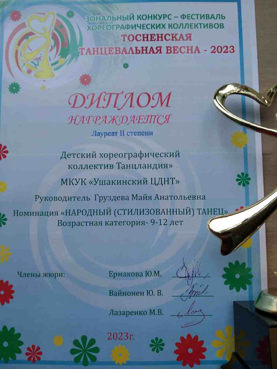 26 марта в Тосненском дворце культуры состоялся зональный конкурс-фестиваль хореографических коллективов "Тосненская танцевальная весна - 2023". Детский хореографический коллектив "Танцландия", руководитель Груздева М.А. Ушакинского центра досуга и народного творчества стал Лауреатом II степени.